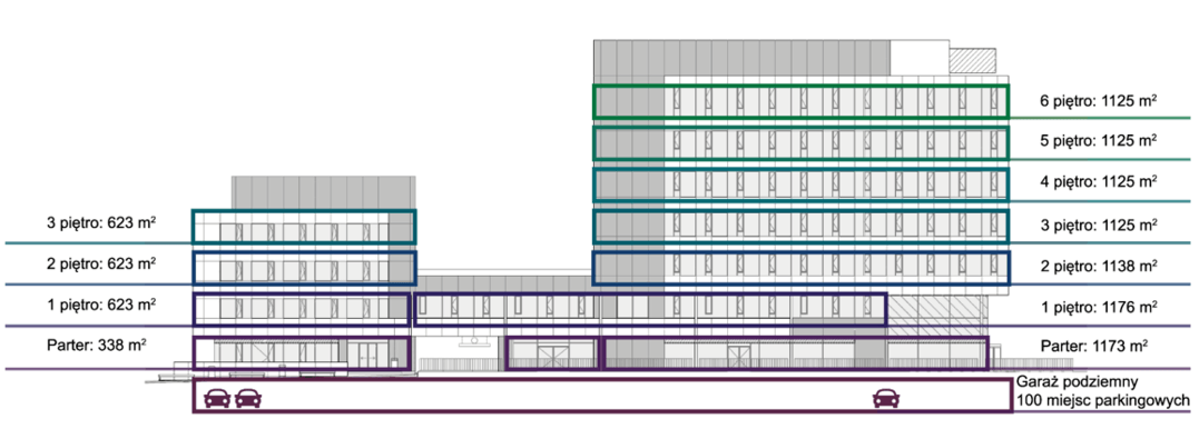 Powierzchnia najmu piętra w części niższej budynku: 623 mkw